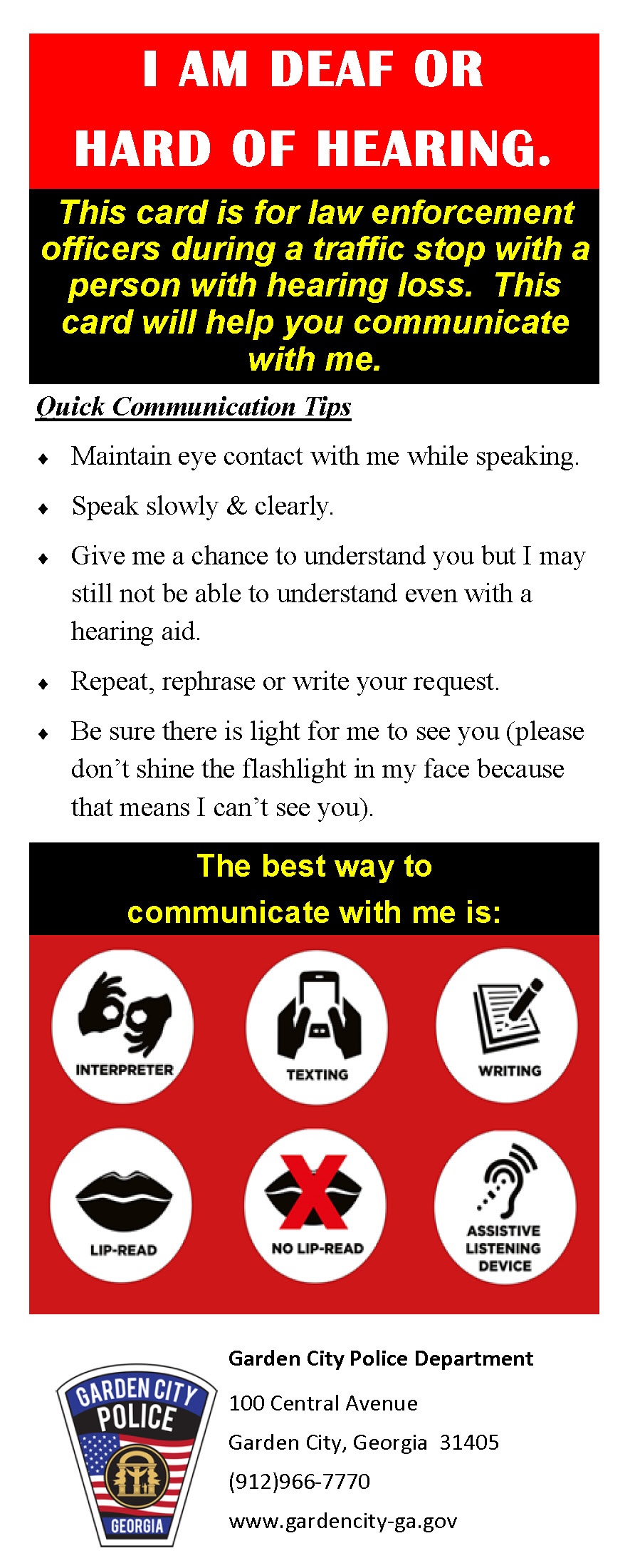 Motorists who are deaf or hard of hearing are encouraged to print out and affix the card below to their car visor. Doing so will make it easier to communicate with officers in the event they are seeking help or are stopped while driving. These cards can also be used in other encounters and contacts with police.